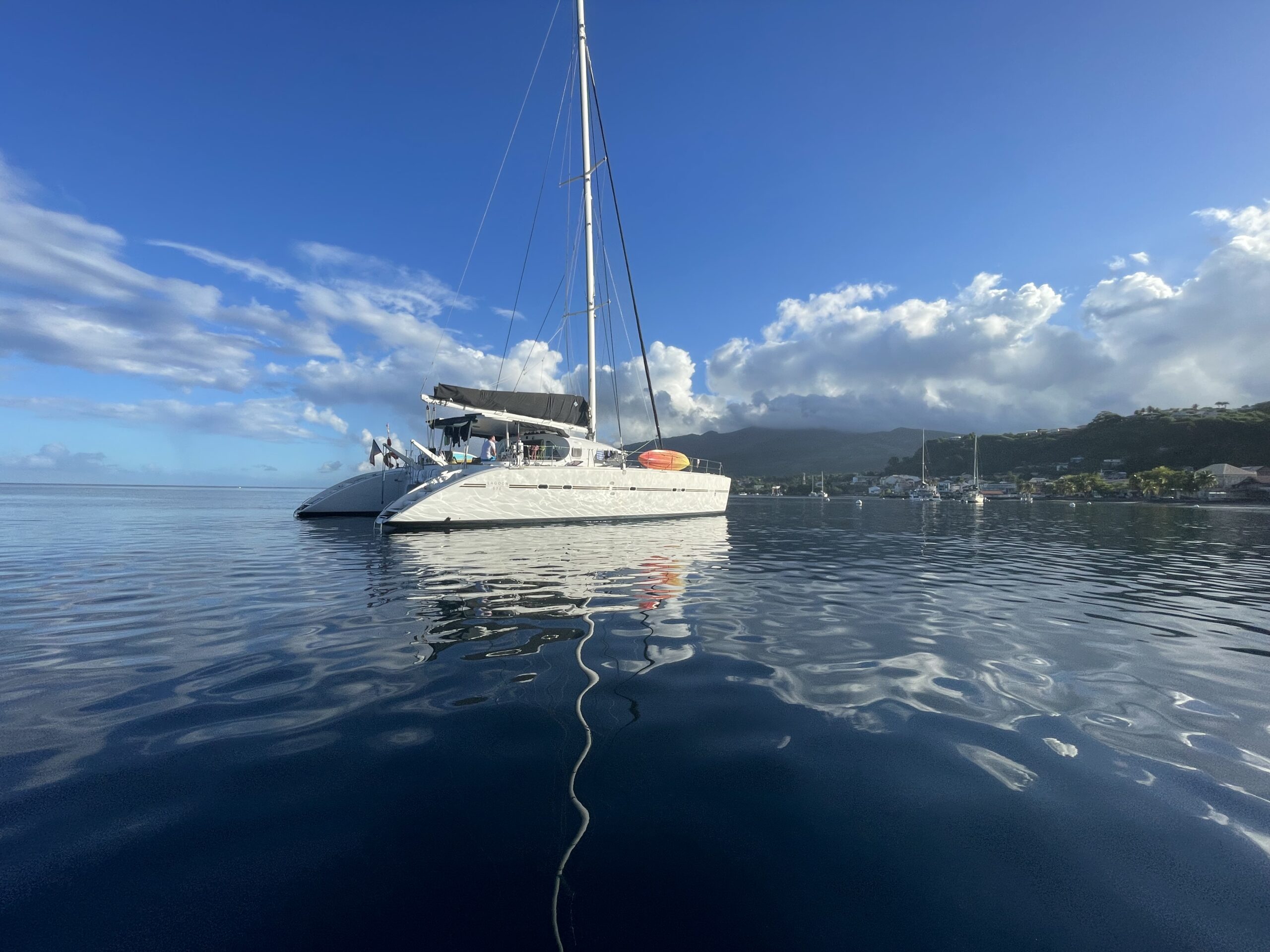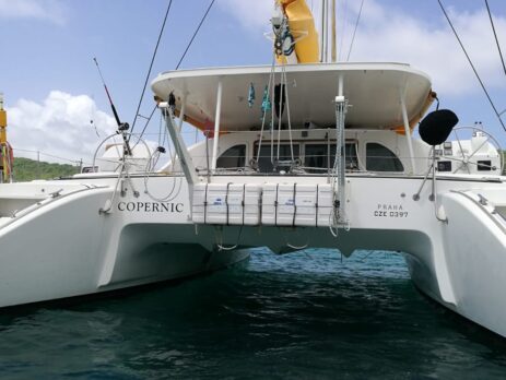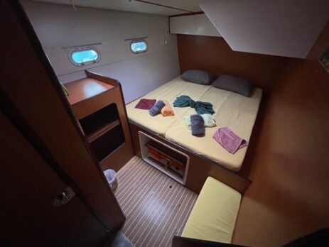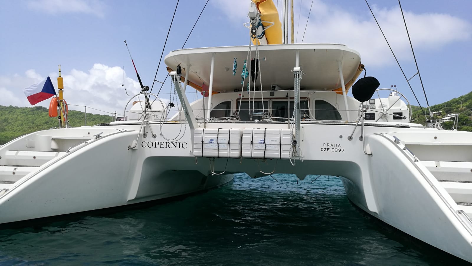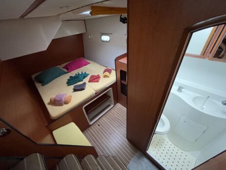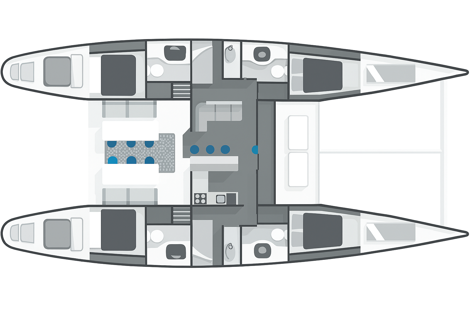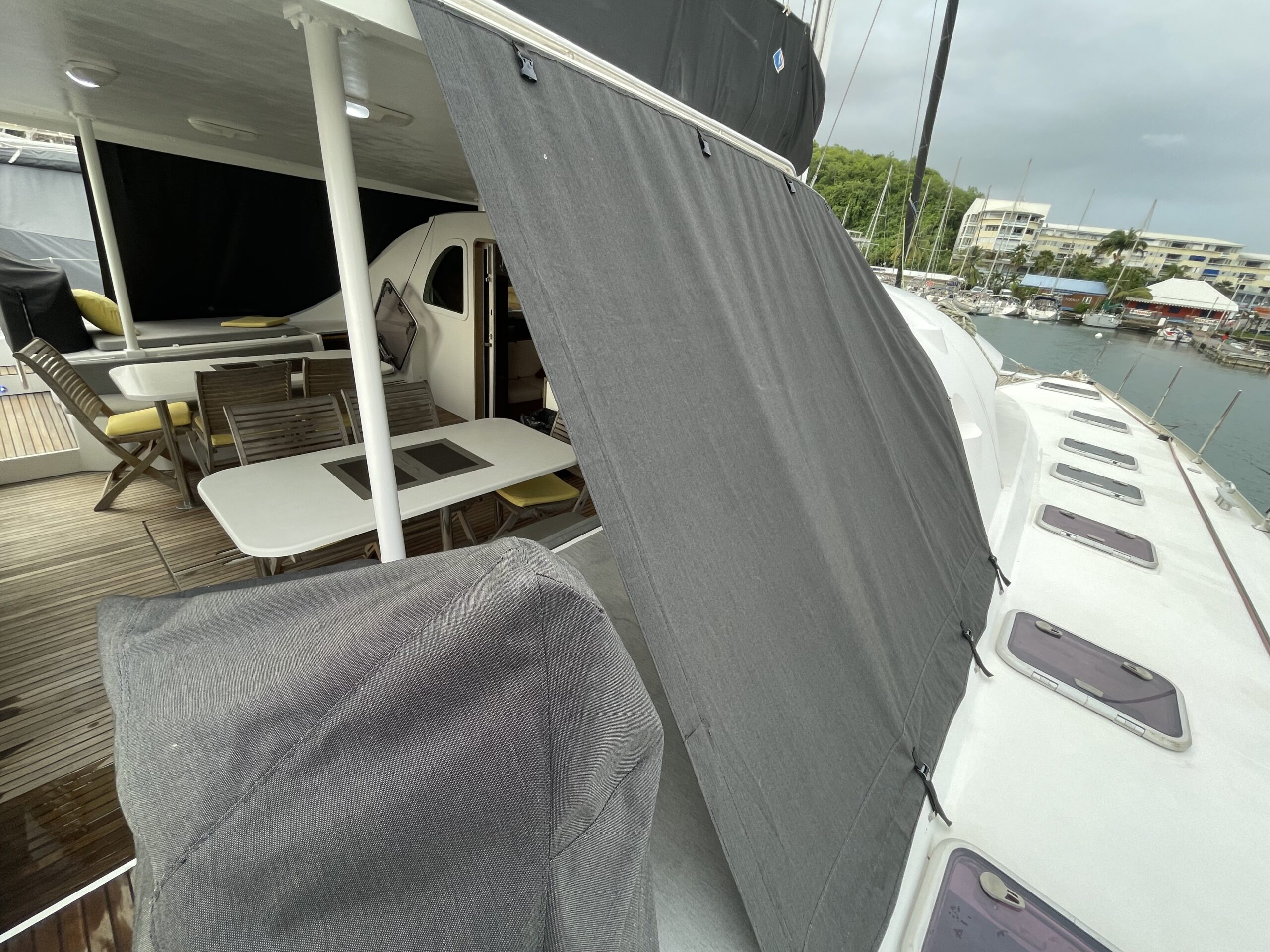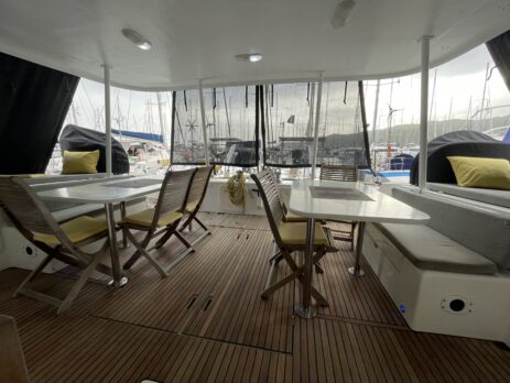 pevná střecha, teaková paluba, plachtové uzavření zadní paluby, oddělené kajuty posádky, vnější sprchy s teplou vodou, bezpečnostní lanové zábradlí, fendry, motorový člun 15hp |