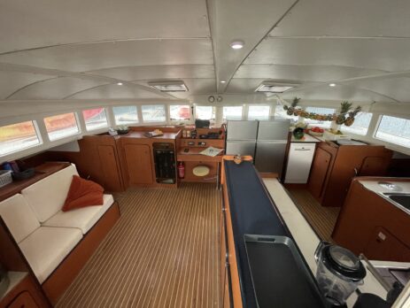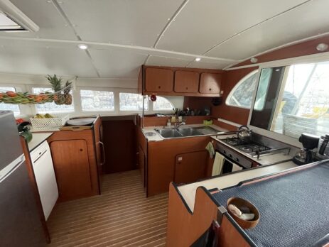 výrobník sladké vody – desalinátor, plynový 4-ploténkový vařič, elektrická trouba, 2× lednička s mrazákem, myčka nádobí, výrobník ledu, bar |